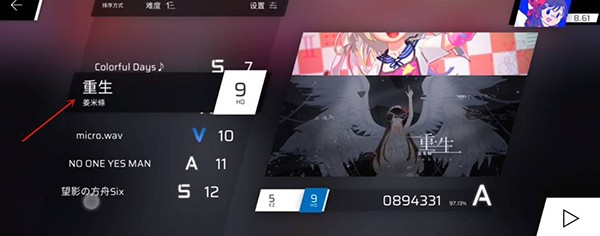 1、首先选择第六章【重生】这首歌,任意难度。