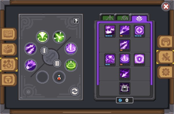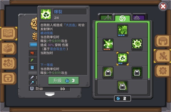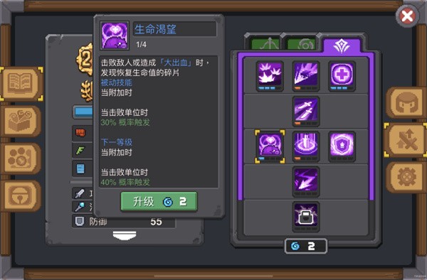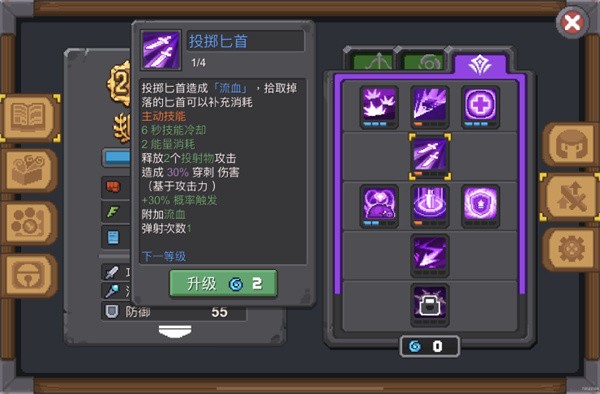 技能以被动(加暴击、加流血、提升属性)为主,辅之以少数的远程主动技能(各1级,)。