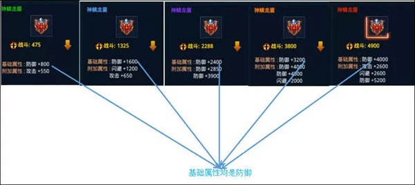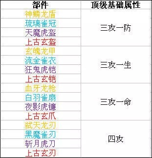 神器的属性有防御、生命、命中、攻击和闪避五种,基础属性只有一条,主要有防御、生命、命中、攻击四种类型。所有神器的基础属性主要由部位决定,像“左上角”部位的龙盾、鸟冠、虎盔、龟盔的基础属性为防御;“右上角”部位的龙甲、鸟衣、虎铠、龟铠的为生命;“左下角”部位的龙矛、鸟扇、虎镰、龟爪的为命中;“右下角”部位的龙刀、鸟刀、虎刀、龟刀的为攻击。