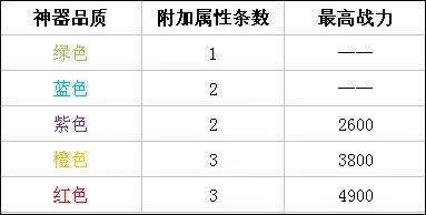 神器的附加属性有防御、生命、命中、攻击和闪避五种,这五种属性则是随机出现的。绿色品质神器只有一条附加属性,蓝色和紫色品质有两条附加属性,橙色和红色有三条附加属性。一般玩家穿戴的神器主要有紫色、橙色和红色三种品质,紫色的最高战力为2600,橙色的战力固定为3800,红色的战力固定为4900。