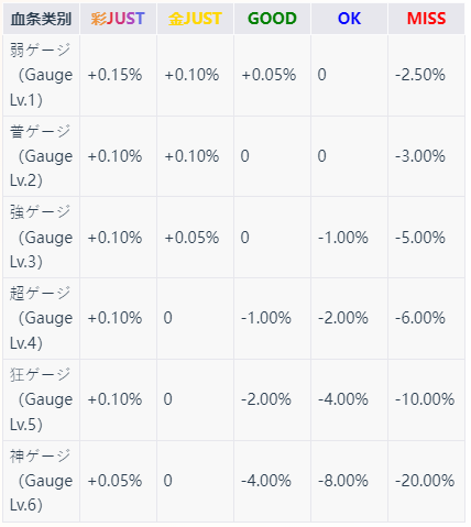 在活动模式与段位模式中,游玩歌曲会出现对应的血条(ゲージ、Gauge)。血条初始状态为100%(满血条),会随玩家游玩时打出的音符判定而变化(最高不会超过100%),血条降为0%时会导致通关失败。游戏中共有6种不同的血条,各级别下,打出各判定的音符。