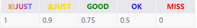 游戏结算时的分数,由每个音符的判定等级决定。具体的得分公式为1000000 ÷ (MaxNotes) × Σ(Judge),其中MaxNotes为可击中的所有音符数量;对于每一个音符,其Judge倍率由下表决定: