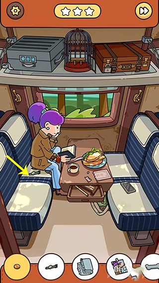1、首先打开脑洞大侦探最新版本,点击打开解谜关卡的猫头鹰列车打开,点击咖啡移开,再点击面包移开,发现金币点击收起。