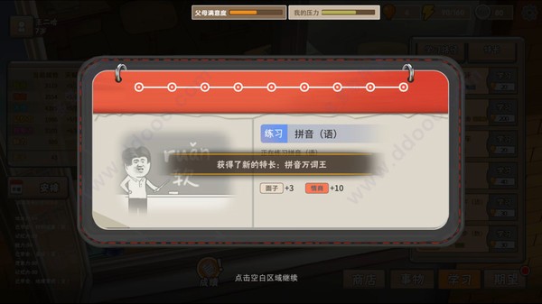 2、当你仅仅是躺在婴儿床的小baby,你的行程安排只能选择学习选项里的翻身,娱乐选项里的跟着音乐拍手。不同的选择会提高不同的属性,也会决定主角日后的命运。你成长至3岁时,已经可以学习美术钢琴课了,而且作为家长也解锁了新功能"面子"功能。