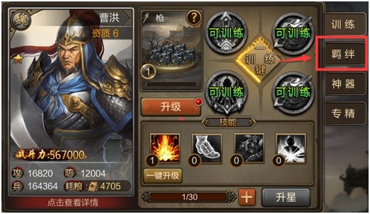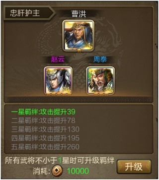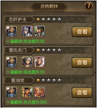 每个武将可以激活三种羁绊,每个羁绊融入三国历史中的一些典故或者渊源,同时也在游戏中会有不同的属性加成,加成的星级数受到每个武将星级的提高而提高,在羁绊列表中需要搭配的武将满足了几星的要求,就可以将羁绊点到几星。