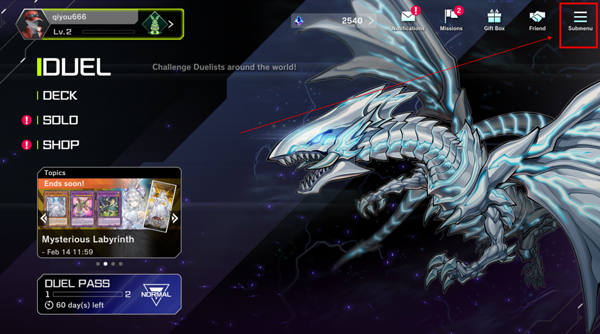 1、打开游戏王大师决斗手机版,进入游戏之后点击右上角Submenu;