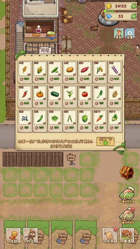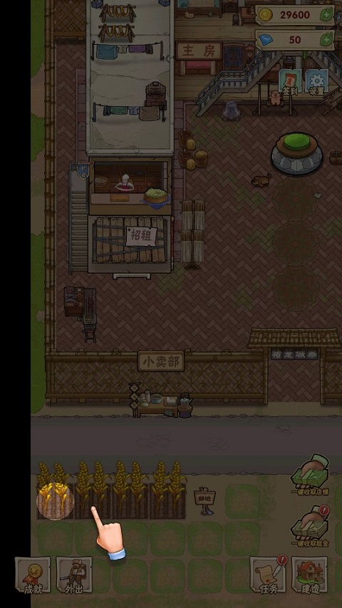 俗话说:万事开头难,游戏前期为玩家们提供了详细的新手教学。首先是耕地,在耕地区域内点击「建造」耕地,然后在黑土地上撒上种子,等待作物的成熟。