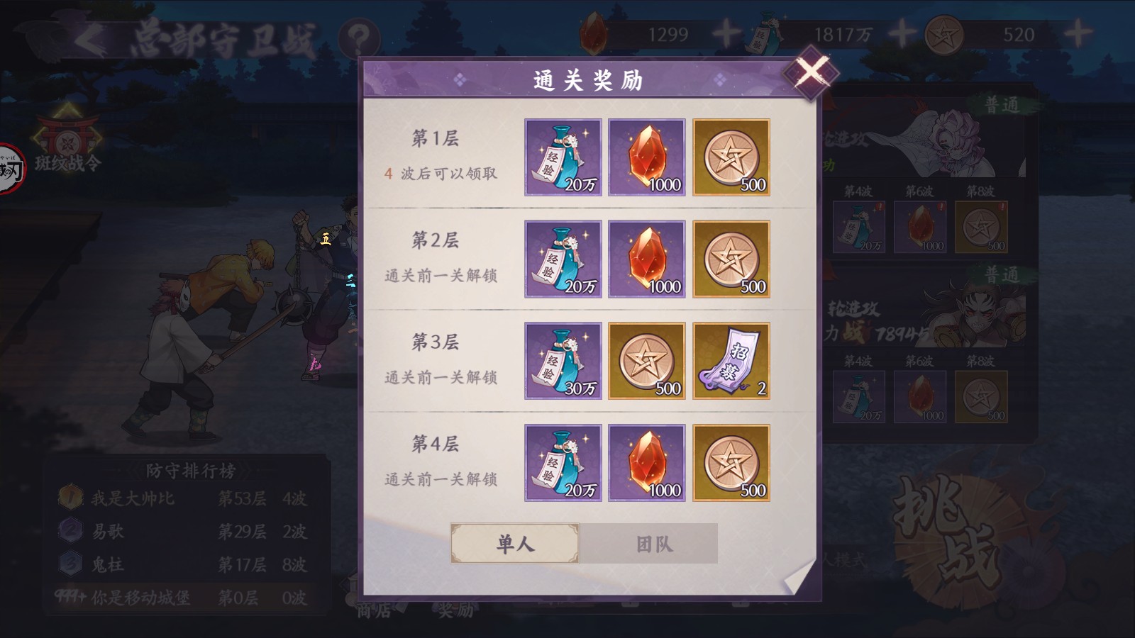 2、首通奖励:首次战胜每一层的第4、6、8波敌人可领取对应的首通奖励,需要手动领取,只能领取一次。