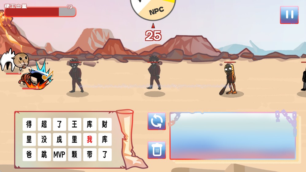 3、玩家需逐一拼出常见的网络热梗词汇,每完成一次正确拼写,游戏上方便会生成对应的梗角色,协助玩家进行战斗。