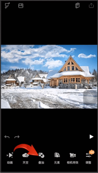 2、接着在相册中选择你要添加烟雾的图片,再点击底部的【叠加】选项。
