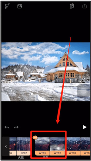 3、向左滑动,在天气分类下,选取第一个或者第二个效果。选择后,照片上方就会出现烟雾缭绕的效果。也可以调整上方的进度条,来增加烟雾的强度。