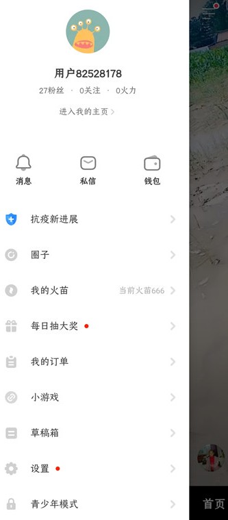 5、抽奖完毕以后,我们回到视频首页,点击页面右上角的【火苗】按钮,来到提现页面。