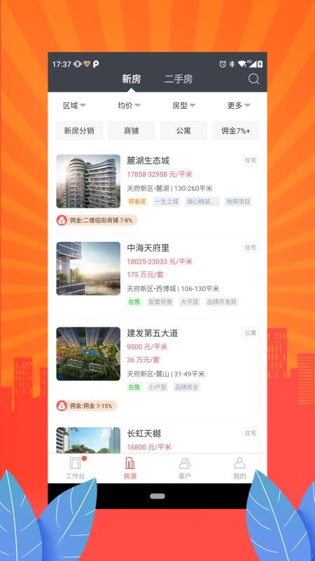 为房产经纪人提供便捷售房的软件,整合了各种房源信息,包括新房分销、商铺公寓、二手房源和角色房源等,随时进入不同的专区中查看各种房源的信息,了解房源的详细内容,并结合客户的需求,将合适的房源推送,为客户解决购买的所有问题;还提供很多处理房源的工具,有报备带看、成交新房、客户管理等便捷的功能,提高用户的工作效率;在首页中也展示实时的房产数据信息,包括房产成交量和二手房成交量,让用户可以实时了解成交的数据信息和情况,掌握每天销售的信息,才能够更好的工作。