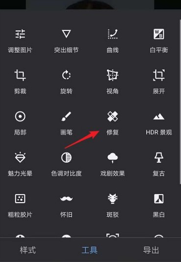 2、在工具列表中,我们需要使用到“修复”工具。点击进入图片的修复界面。