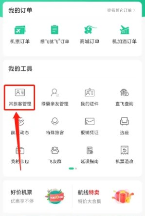 2、进入我的,点击【常旅客管理】。