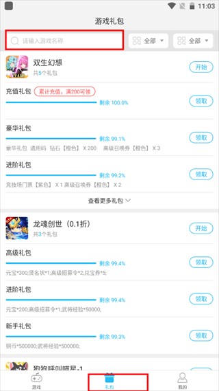3、通过“礼包”页面搜索领取游戏礼包。