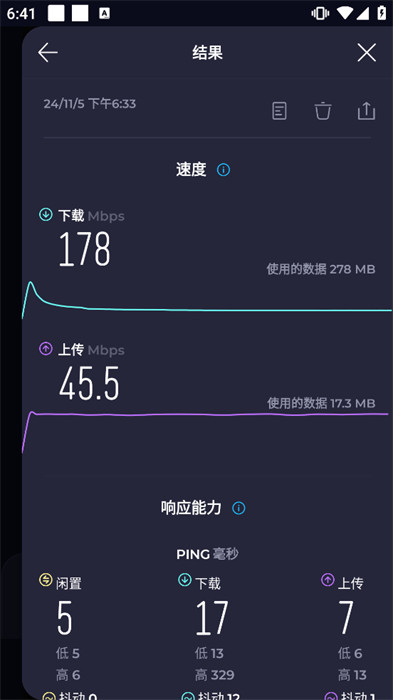 Speedtest最新版是一款非常专业高效的手机网络测速软件,这里提供精准的网速测试功能。无论用户处于何种网络环境,都能快速准确地检测并分析网络延迟,帮助用户更好地了解网络性能。另外所有测速结果都会自动保存,方便用户随时查看和对比历史数据。除了基本的网络测速外,还能帮助分析网络问题,为用户提供更全面的网络诊断。通过支持全球多个服务器,确保即使在世界各地,用户也能获得准确的测速结果。