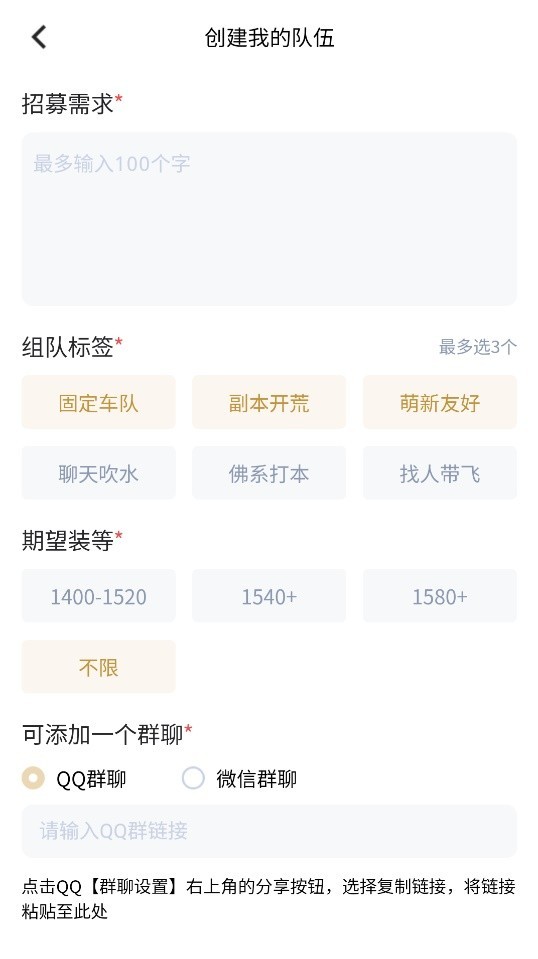 3、在创建队伍时冒险家需要将自己的招募需求写明,最多输入100字,并将组队标签和期望装等勾选,组队标签最多可选3个,最后冒险家们需要添加一个群聊,QQ微信均可,详细的招募需求和标签更便于冒险家们找到志同道合的“方舟搭子”哦~