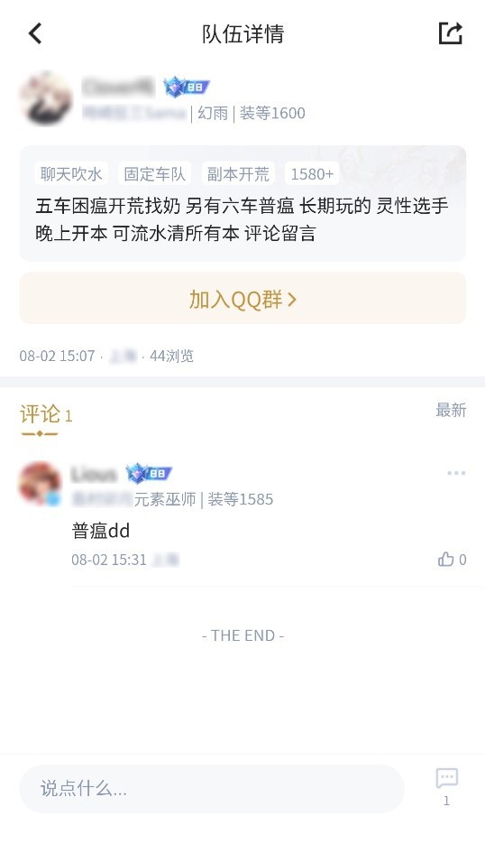 5、冒险家点击队伍后可以查看队伍详情,可以查看该队伍发起者的道具等级、职业、队伍标签、需求道具等级和队伍详情等信息,还可以在队伍详情下方进行评论与队伍发起者互动,在确认了想加入该队伍后可点击加入QQ群或者微信群与其他队友进行交流。
