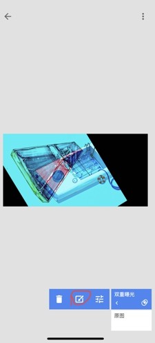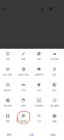 3、打开图片点一下下方的工具按钮后从众多工具中选择“双重曝光”。